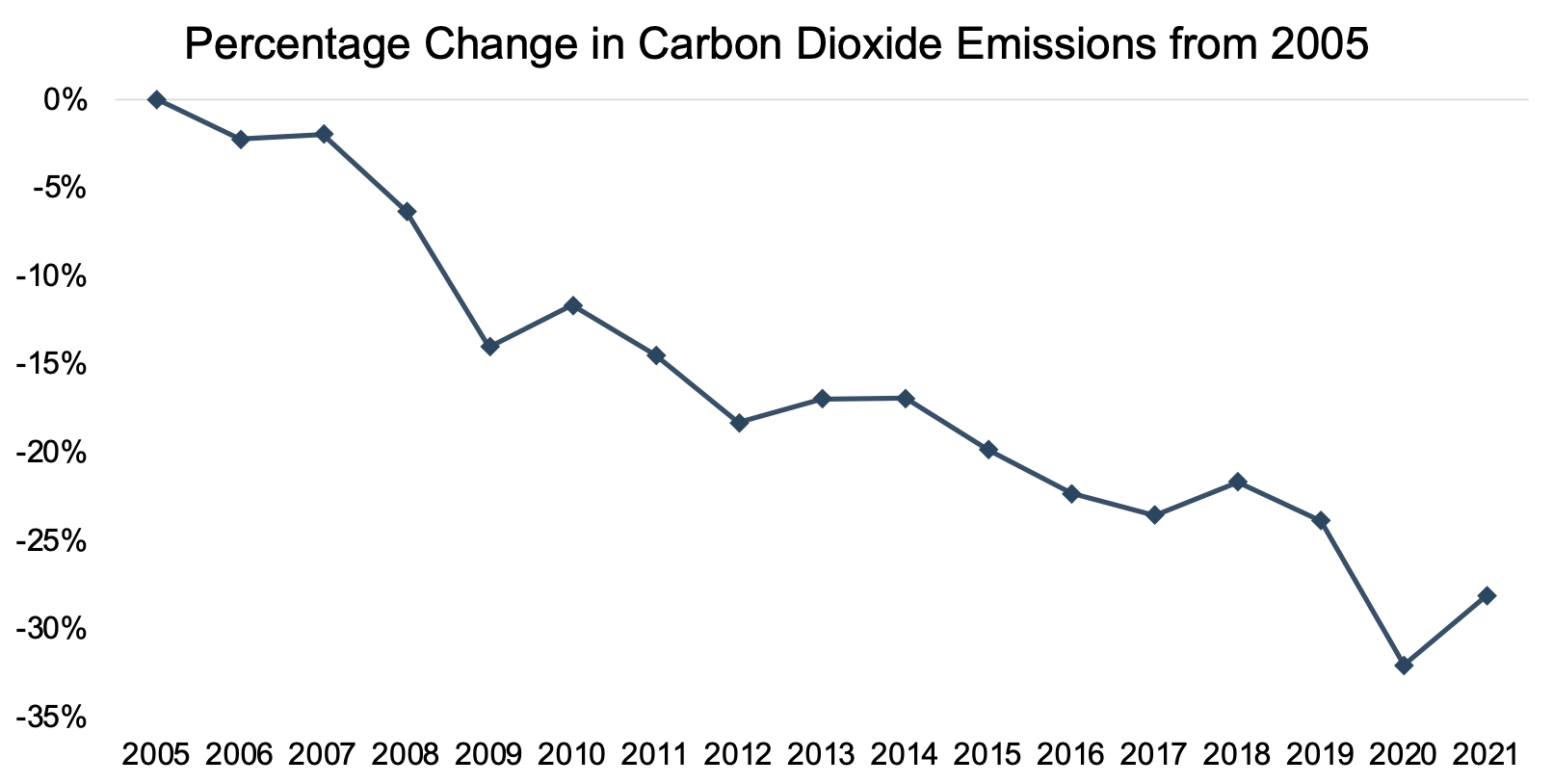 Zamarin also noted that as natural gas market share has increased since 2005, CO2 emissions have declined. As a point of reference, I refer to the chart below, which is based on data from the Global Carbon Project (2022). The data indicate a decline in CO2 emissions of nearly 30% in the U.S. since 2005.