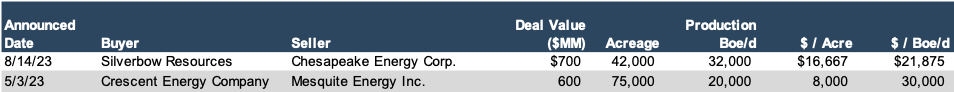 Chesapeake’s sale to Silverbow Resources is an extension of Chesapeake’s sell-off during the twelve months ended February 28, 2023 (see table below), during which Chesapeake sold a combined 549,000 acres over two deals. On the flip side, Silverbow Resources has continued its buying binge by purchasing assets from Chesapeake, adding to the four purchases it made during the twelve months ended February 28, 2023 (see table below). Silverbow Resources spent $547 million on these four purchases, adding 76,000 acres to its portfolio at $7,197/acre.
