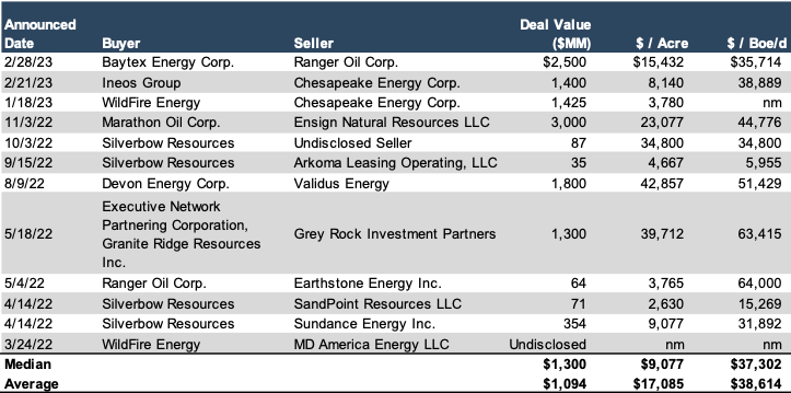 During the twelve months ended February 29, 2024, Silverbow Resources purchased 42,000 acres from Chesapeake Energy for $700 million, while Crescent Energy purchased 75,000 acres from Mesquite Energy for $600 million. The total deal value of the two deals, $1.3 billion, equals the median deal value of the 13 deals for the twelve months ended February 28, 2023. A table detailing these two transactions is shown below.
