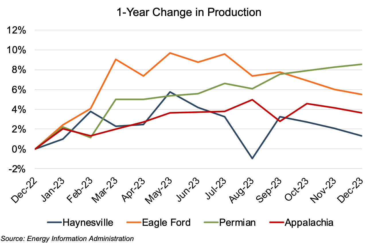 Estimated Haynesville production (on a barrels of oil equivalent, or “boe” basis) rose by 1.3% year-over-year through November — marking it as the basin with the smallest increase among those included in our analysis. While Haynesville production growth over December 2022 levels generally crept upward through April (reaching a high of 5.8% through April), the trajectory turned downward with only a single uptick month during the remainder of the year. Production growth in the remaining basins (the Eagle Ford, Permian, and Appalachian) was more robust, with the Eagle Ford posting the 2023 growth high mark at 9.7% in April. Year-over-year growth for those basins showed increases of 5.5%, 8.5%, and 3.6%, respectively. The slower expansion of the Haynesville can be attributed to its significant decline in rig count throughout 2023, surpassing the declines observed in the other three basins.