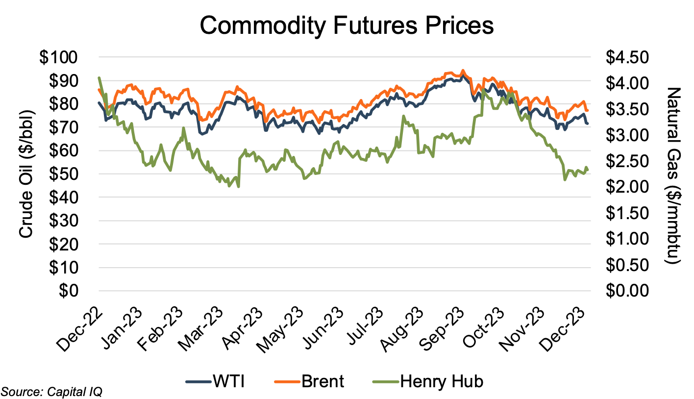 Oil prices, as benchmarked by WTI and Brent, showed much less volatility than natural gas prices during the year, generally varying between $67 and $82 (WTI) and $73 and $89 (Brent) through early March. The price range narrowed slightly during May and June, with WTI only ranging from $67 to $76 and Brent from $71 to $80. The benchmarks began a three-month upward run in late June, reaching their 2023 highs — only to reverse course to head downward through mid-December.