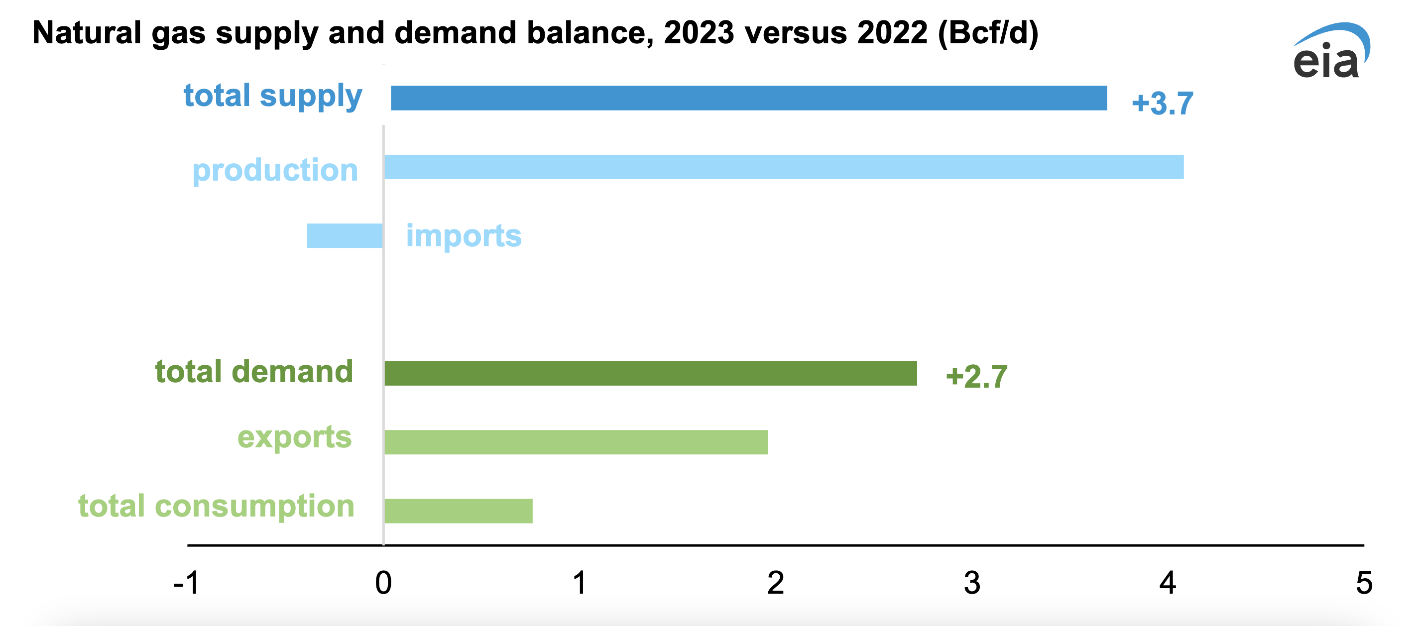 The EIA attributed the 2023 natural gas pricing decline to record production that outpaced consumption, as indicated in its January 2024 In Brief Analysis and as depicted below.