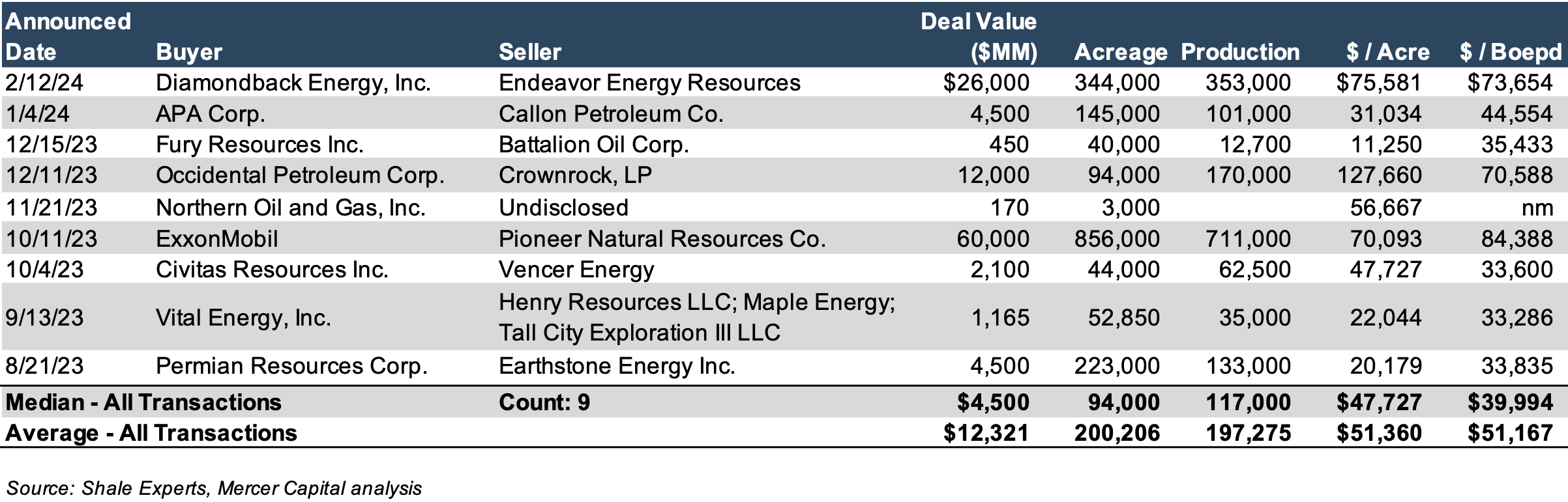 Relative to 2022-2023, the median deal size over the past 12 months was approximately $4.5 billion, approximately 9.5x larger than the median deal size of $475 million in the prior 12-month period. The median acreage purchased over the past year was 94,000 net acres, nearly 5.0x higher than the 16,000 acres among the deals in the previous year. When looking at acquired production, the median production among transactions over the past year was 117,000 barrel-oil-equivalent per day (“Boepd”), a monstrous 800% increase from the 13,000 Boepd metric from the prior year.