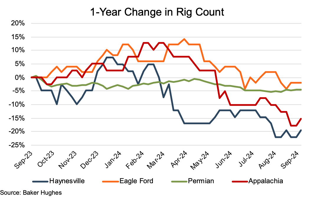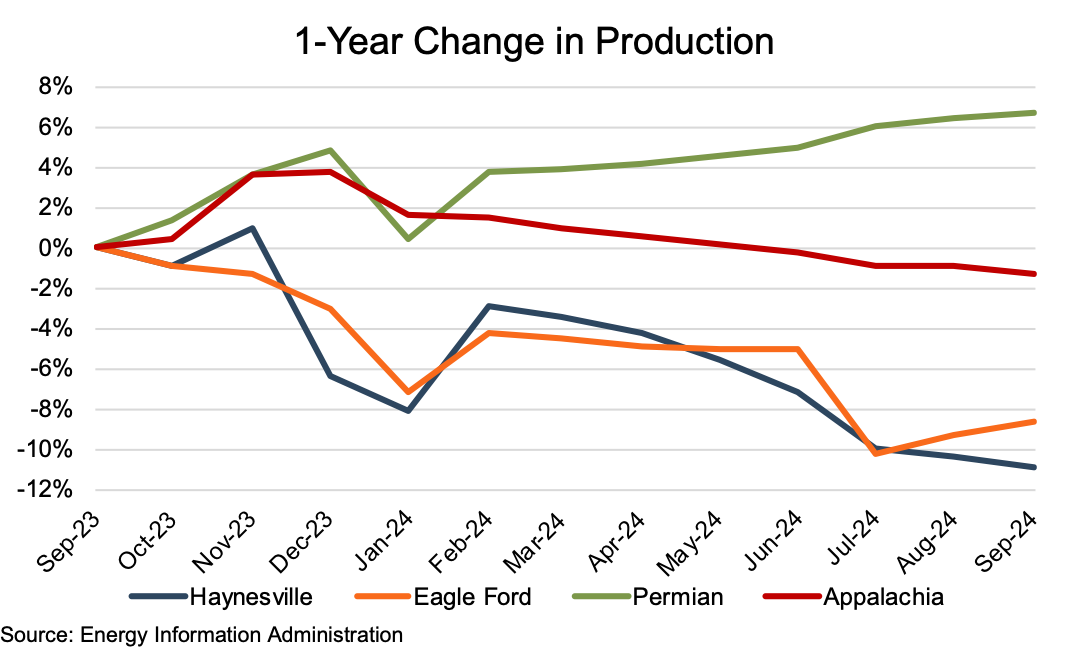 Appalachian production (on a barrels of oil equivalent, or “boe” basis) edged lower by 1.3% over the latest twelve-month (“LTM”) period.  After an initial 3.7% production run-up through November 2023, Appalachian production began a long, steady decline through August 2024.  The production slide was precipitated by multiple factors, including seasonal declines, weak commodity pricing, and competition from other regions closer to LNG export facilities.  In particular, EQT — the largest U.S. natural gas producer — purposefully reduced production volumes in consideration of surplus storage levels.  Other Appalachian producers were following the same strategy.