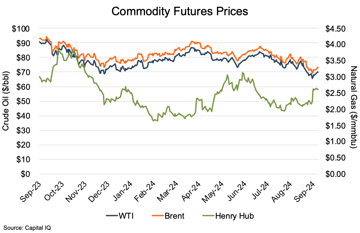 Henry Hub natural gas front month futures prices showed the commodity’s usual seasonal volatility over the September 2023 to September 2024 review period.  The futures’ price ran from $2.84 in early October to $3.82 in mid-October due to unusually low temperatures across much of the U.S., pushing residential and commercial consumption up 51%.  Beginning in November, the Henry Hup futures turned sharply downward, with the decline continuing nearly uninterrupted through mid-February.  The November to February 57% drop was precipitated in large part by excess supply.  While gas producers were proactively cutting drilling and production in the face of 30-year low prices, gas production from oil producers that produce gas as a byproduct of their oil production operations continued to buoy supplies.