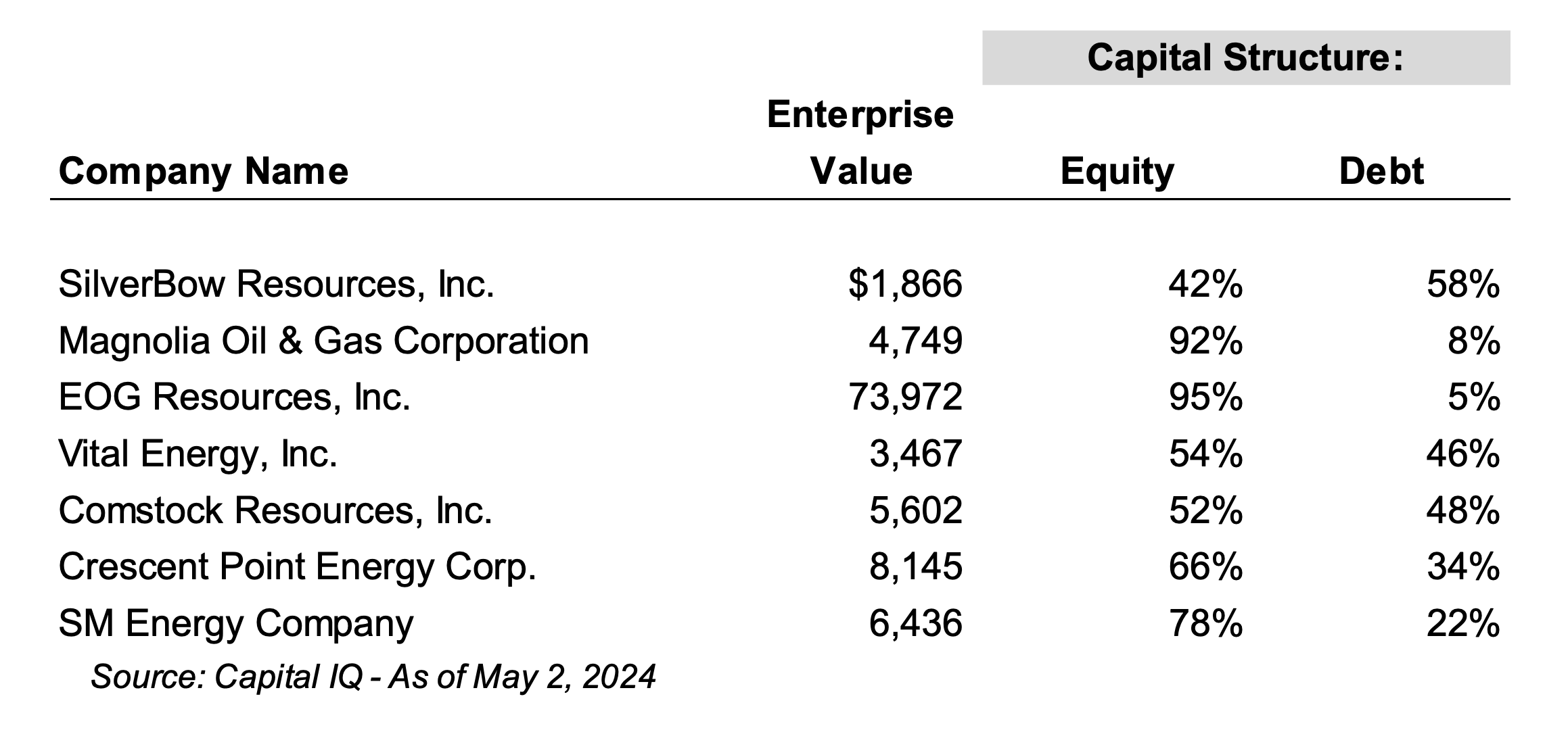 What defines a heavy debt load? It depends. The ratio of debt to EBITDA is cited often in the industry. These days at or below a 1.0x ratio is what companies frequently aim for, SilverBow included. However, there is not a definitive answer to the question. From a capital structure perspective, SilverBow has a higher debt-to-equity market capitalization percentage than the companies listed below that have varying similarities to SilverBow: