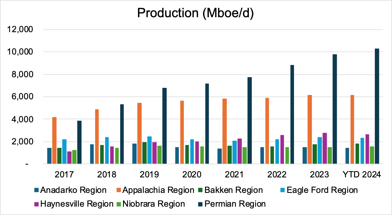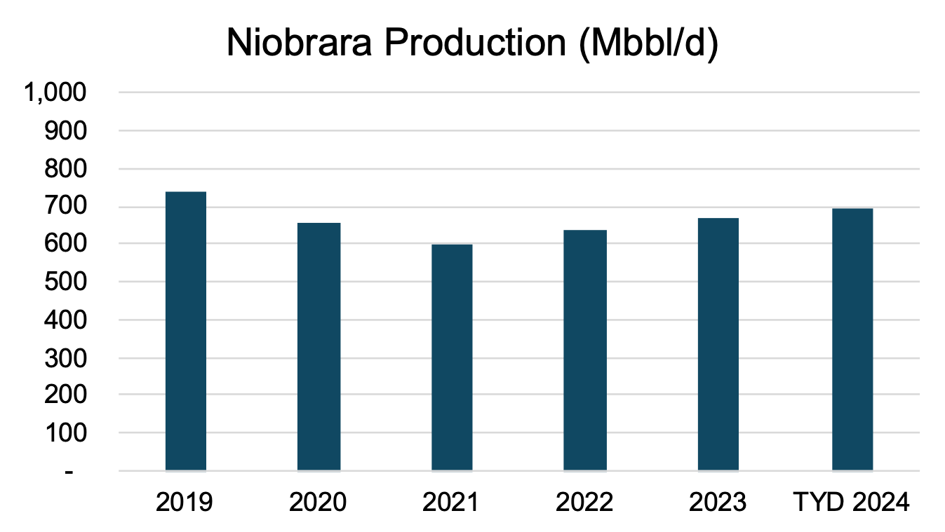 From an economic standpoint, the DJ Basin has long contributed significantly to the U.S. energy sector. Data from the U.S. Energy Information Administration (“EIA”) reveals the DJ Basin was among the top five oil producers in 2023. Specifically, the Niobrara region within the basin recorded a daily average output of 670,000 barrels of oil (mbbl/d) and 1,534,000 barrels of oil equivalent (mboe/d). The Niobrara shale, predominantly an oil-rich formation, is situated in northeastern Colorado with extensions into Wyoming, Nebraska, and Kansas. The DJ Basin wasn’t immune to the downturns brought on by the Covid-19 pandemic, seeing a dip in production. Nevertheless, since 2021, there has been a steady resurgence in output, with figures nearing those seen prior to the pandemic.