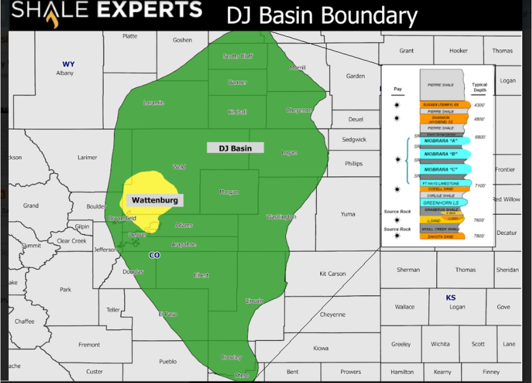 The Denver-Julesburg (“DJ”) Basin is a vast and geologically complex basin marked by sedimentary layering, tectonic shifts, and hydrocarbon generation. Encompassing an area of approximately 20,000 square miles, it stretches across regions of Colorado, Wyoming, Nebraska, and Kansas. Notable within the basin are various fields and geological formations, including the Wattenberg Field, Niobrara, Codell, Greenhorn, Adena Field, Hereford area, and the Redtail Field area.
