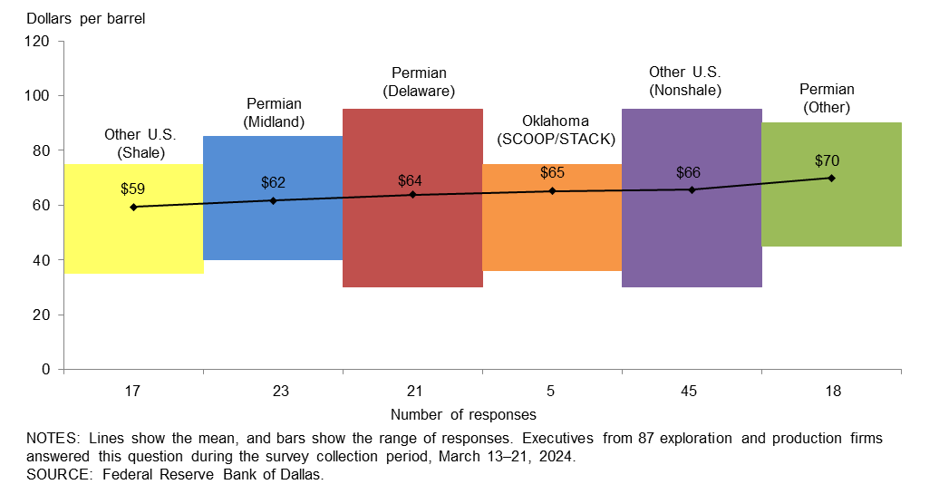 That sentiment is continuing into longer term estimates as well. The NYMEX curve was in contango as of the time of this article, meaning that futures prices are lower than current prices. The December 2028 contract was below $64. The Dallas Fed Survey respondents were more optimistic about overall prices but displayed a similar declining trend in their estimates. More respondents estimated lower prices on average than higher prices. Two-year price estimates fell from $81 as of September 2024, to $74 as of December 2024. Same for longer term estimates as well.