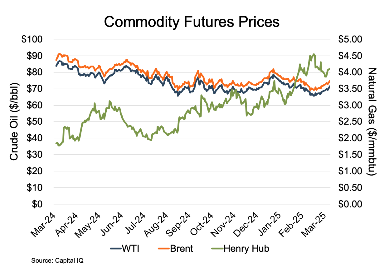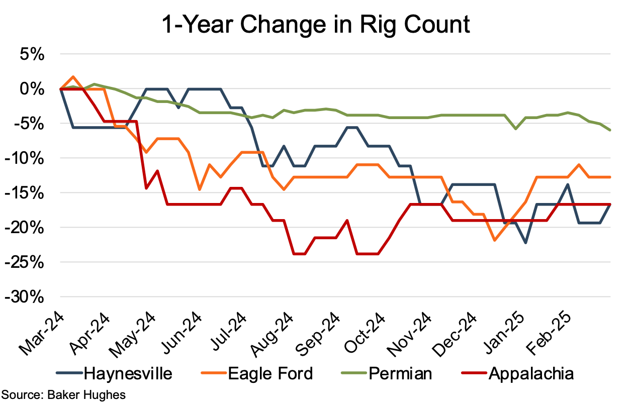 All four regions suffered rig count declines over the year ending March 2025. Haynesville and Appalachia tied for the largest percentage decline at 17%, with Eagle Ford posting a slightly lower 13% decline. Even the stalwart Permian ended the period with a YoY decline, though the most modest for the four regions, at 6%. The returning culprit was reduced commodity prices, leading to the rig count reductions.