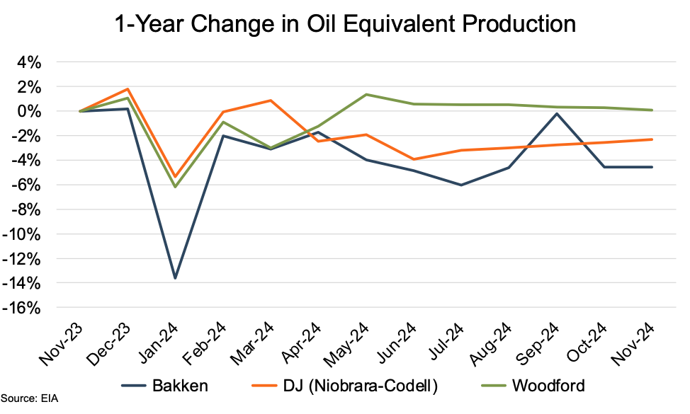 Two of the three shale plays ended 2024 with production levels (on a barrels of oil equivalent, or “boe” basis) below those of the previous year. The DJ Basin ended the review period 2% below levels from a year earlier, while the Bakken ended at nearly 5% lower. Only the Woodford Shale ended the review period at a level above its November 2023 production, though at a negligible 0.1% higher.