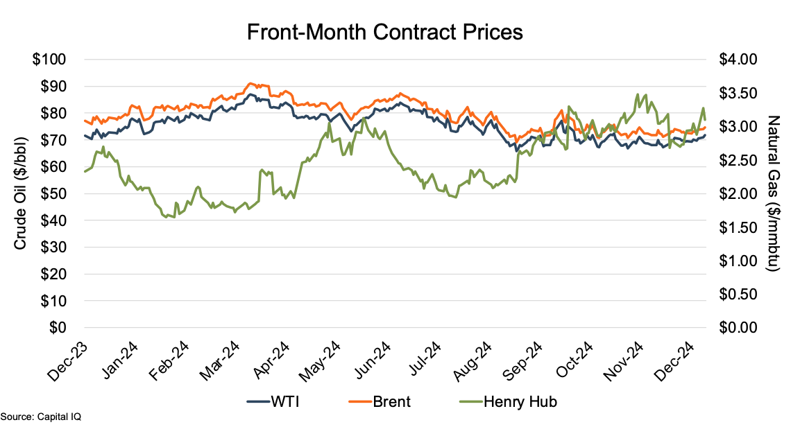 Oil prices, as benchmarked by West Texas Intermediate (WTI) and Brent Crude (Brent) front-month future contracts, generally rose through early April to then 2024 highs of $83.85 (WTI) and $88.21 (Brent) from year-end 2023 prices of $71.65 and $77.04, respectively. The steady rise was largely the result of rising tensions in the Middle East that eased concerns about too much U.S. production and continuing OPEC+ production cuts.