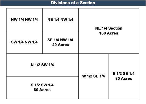 Most of the United States uses the Public Land Survey System which is divided into townships and further into sections. A township is 36 sections and a section is 640 acres (or one square mile). ¹