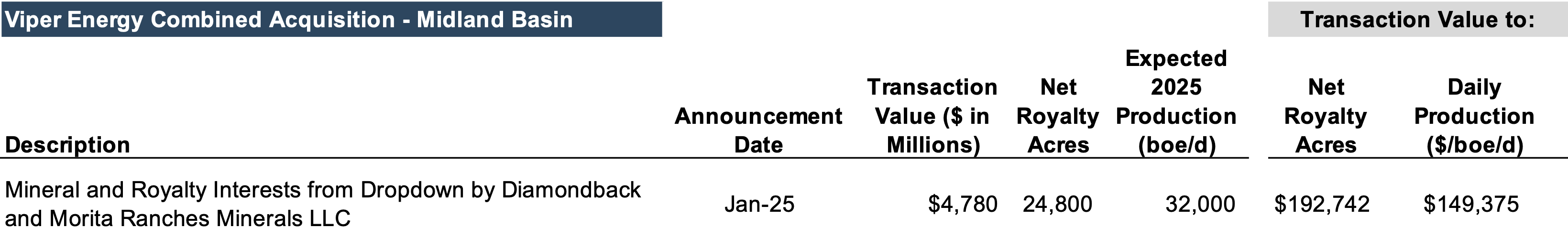 The dropdown was announced in combination with Viper's purchase of mineral and royalty interests from Morita Ranches Minerals LLC for $330 million based on the 30-day average price of Viper's units. The combined purchase includes 23,100 net royalty acres in the Midland Basin and 1,700 net royalty acres in the Delaware and Williston Basins. Expected 2025 production from the combined assets is 32,000 boe/d).