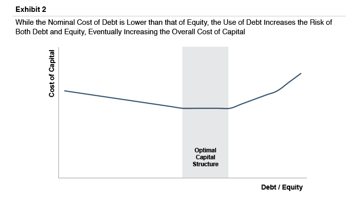 However, increasing the proportion of debt in the capital structure increases the risk of both the debt and the equity, which in turn raises the cost of each. As illustrated in Exhibit 2, at some point the benefit of using a greater proportion of lower-cost debt is eventually offset by the escalating cost of both capital sources.