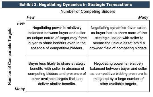 By combining the target with their existing operations, the larger strategic buyer will be able to achieve purchasing efficiencies, which will contribute to a higher gross margin.  In addition, there are redundant general and administrative expenses, which can be eliminated by the buyer.  As a result, the strategic buyer anticipates generating an EBITDA margin of 22%, compared to the 16% EBITDA margin available to the target company on a stand-alone basis.  Stated alternatively, the strategic buyer anticipates EBITDA that is 38% higher. Does that mean that the target company is worth 38% more to the strategic buyer?  Not necessarily.  The amount that a strategic buyer will, in fact, pay for the target company depends on how many other strategic buyers they are likely bidding against and how unique the target company opportunity is. The magnitude of strategic benefits available and the likely negotiating dynamics for a family business tend to be very fact-specific.  So, assessing the value of your family business to a strategic buyer will require that you and your fellow directors consider the following questions: