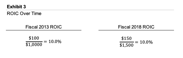 Focusing on profit alone will not reveal the answer. But a quick calculation of ROIC shows us what has gone wrong. Exhibit 3 presents the ROIC calculations for 2013 and 2018.