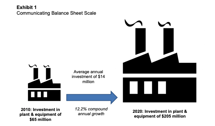 Is $1 million a lot of money? The answer to that question depends, of course, on your perspective. For a family-owned restaurant, it may be everything; but for Ford Motor Company, it is a rounding error. To have any meaning, balance sheet totals need context. As a raw data point, the fact that your business has net fixed assets of $205 million is meaningless to your family shareholders. To really communicate scale, you need a reference point, whether a prior date in your family business’s history, a contemporary peer, or some other benchmark. Exhibit 1 is an example of contextualizing balance sheet scale.