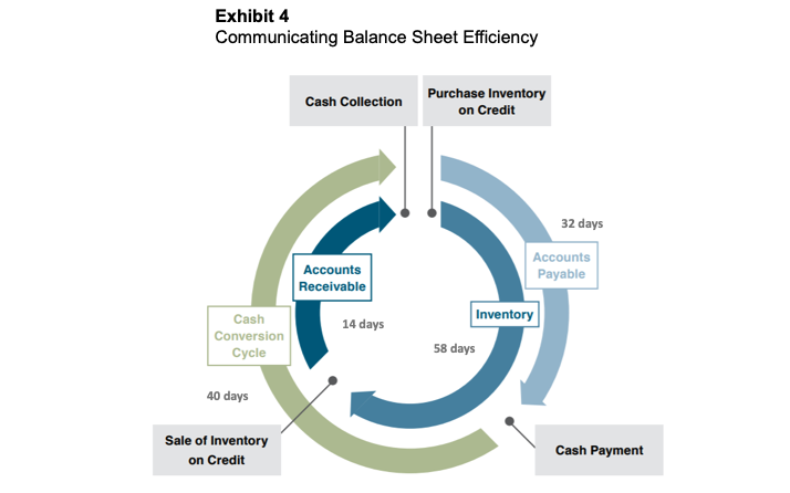The cash conversion cycle measures the working capital efficiency of a business. In other words, how much family capital is tied up in inventory and receivables? Since the return on working capital is often relatively low, managers generally try to reduce their balance sheet allocation to working capital. Exhibit 4 provides an example of how to communicate the cash conversion cycle to family shareholders.