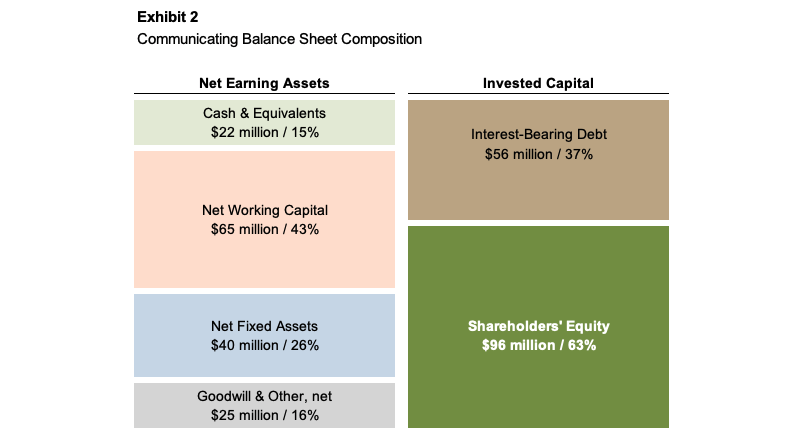 It is hard to beat a pie chart or area model for demonstrating the composition of a whole. Exhibit 2 illustrates one way to use area models to communicate the composition of the balance sheet.
