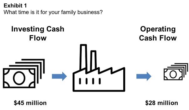 Exhibit 1 illustrates how the investing and operating cash flows interact to reveal the “time” for your family business.