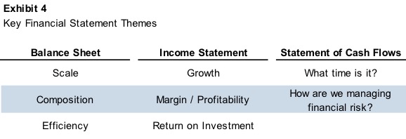 Our objective in this series of posts has been to give our readers some examples of how to communicate financial results more effectively. Financial statements include lots of financial data. The first step in effective communication is identifying the key themes that really matter to family shareholders. Exhibit 4 recaps the key themes we have identified from each financial statement.