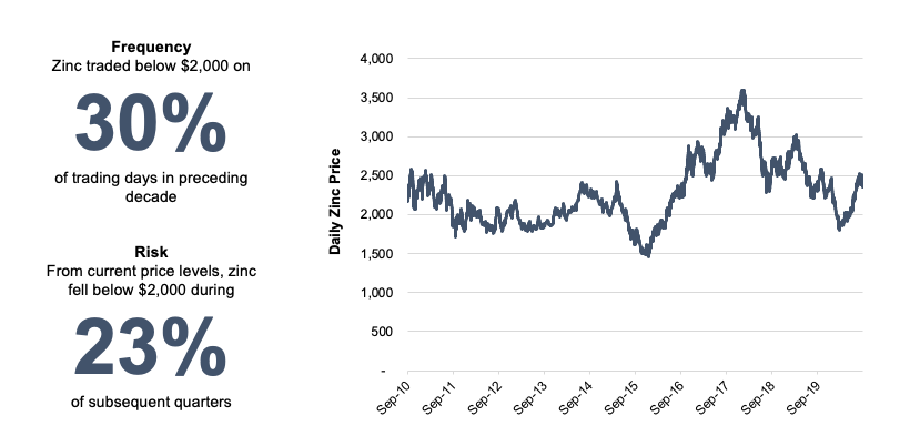 Companies with commodity exposures offer a ready example.  Consider a family business whose earnings and financial condition are correlated to the price of zinc. If the company’s gross profit declines when the price of zinc falls below $2,000, a risk disclosure to the family shareholders might include both the percentage of time zinc has traded below that level in the past 20 years, and the frequency with which the price has fallen below $2,000 from the current price during the subsequent three months as shown below.