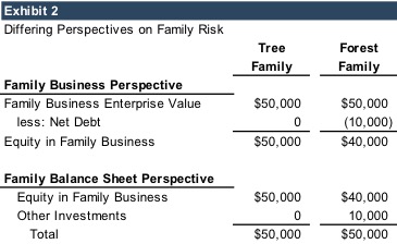 • If we limit our perspective to the family business (the top panel of Exhibit 2), the Tree Family bears less risk. But if the Forest Family has used its “excess” distributions over the years to accumulate a portfolio of other investments that are uncorrelated to the family business, the risk assessment shifts.  While the risk of the Forest family business is higher because of the additional debt, the overall family balance sheet for the Forests may actually be less risky than that of the Trees.