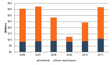- Dividends were much less affected than share buybacks. Of the 274 dividend payers in our sample, only 57 reduced per share dividends during 2009, reflecting the powerful signaling property of dividend payments. Reducing the annual dividend is likely the last resort for public companies seeking to conserve cash. However, as shown on Exhibit 5, public companies tend to use more cash in share repurchases than dividend payments. From more than $28 billion in 2007, share repurchases fell to $19 billion in 2008, and bottomed out at $4 billion in 2009. The irony, of course, is that due to the depressed share prices, 2009 is precisely when repurchasing shares would have had the highest prospective return for public companies.