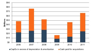 The data doesn’t reveal the answer to the most relevant question: what was the long-term impact of the dramatic reduction in investment spending in 2009? Revenue growth accelerated in 2010 and 2011 to rates higher than those experienced in 2007 and 2008. Part of that is likely attributable to pent-up demand from the weak results in 2009, but it does at least give us pause to wonder what portion of “ordinary” investment spending is effectively squandered by companies.