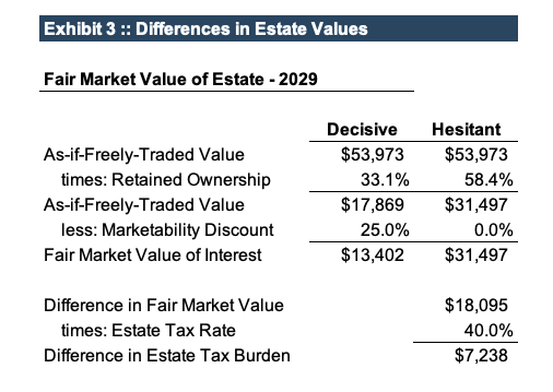Because the gifts under the Decisive scenario were made while share prices were depressed because of the coronavirus, a larger portion of the shares were transferred than in the Hesitant scenario. As a result, the founder retained just 33% of the total shares after using the $12 million lifetime exclusion, compared with 58% under the Hesitant scenario. As shown in Exhibit 3, the effect on the resulting taxable estate is compounded because, under the Hesitant scenario, the 58% retained interest represents a controlling position in the shares and the value is not reduced for the marketability discount. In fact, although not shown in Exhibit 3, a control premium to the as-if-freely traded could be applicable, which would exacerbate the disparity.