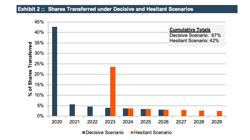 Since the annual gifts are for fixed dollar amounts, lower per-share values result in more shares being transferred, which reduces the amount of shares in the future taxable estate, all else equal. Exhibit 2 summarizes the shares that are transferred under the gifting program for the Decisive and Hesitant scenarios.