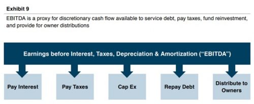 The following chart (Exhibit 9 from our whitepaper, Basics of Financial Statement Analysis) illustrates the five basic uses of EBITDA.