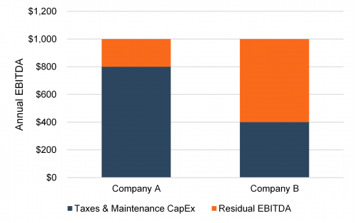 The point of all this is that a dollar of EBITDA is not just a dollar of EBITDA.  The quality of a dollar of EBITDA depends on how much of that dollar is allocable to taxes and maintenance capital expenditures.  Consider the two companies summarized in the following chart.Company A and Company B both generate the same amount of EBITDA, yet Company B’s EBITDA is of much higher quality because taxes and maintenance capital expenditures consume a much smaller portion of EBITDA than for Company A.  Accordingly, investors will likely assign a higher EBITDA multiple to Company B than Company A (all else equal).  This is borne out when we look at data for non-financial companies in the Russell 2000. The value assigned by the market to each dollar of EBITDA follows a predictable pattern as depreciation & amortization consumes a greater portion of EBITDA.  Ideally, we would look at depreciation only, but the data aggregation services generally only provide the aggregate number.  Even so, the point stands.