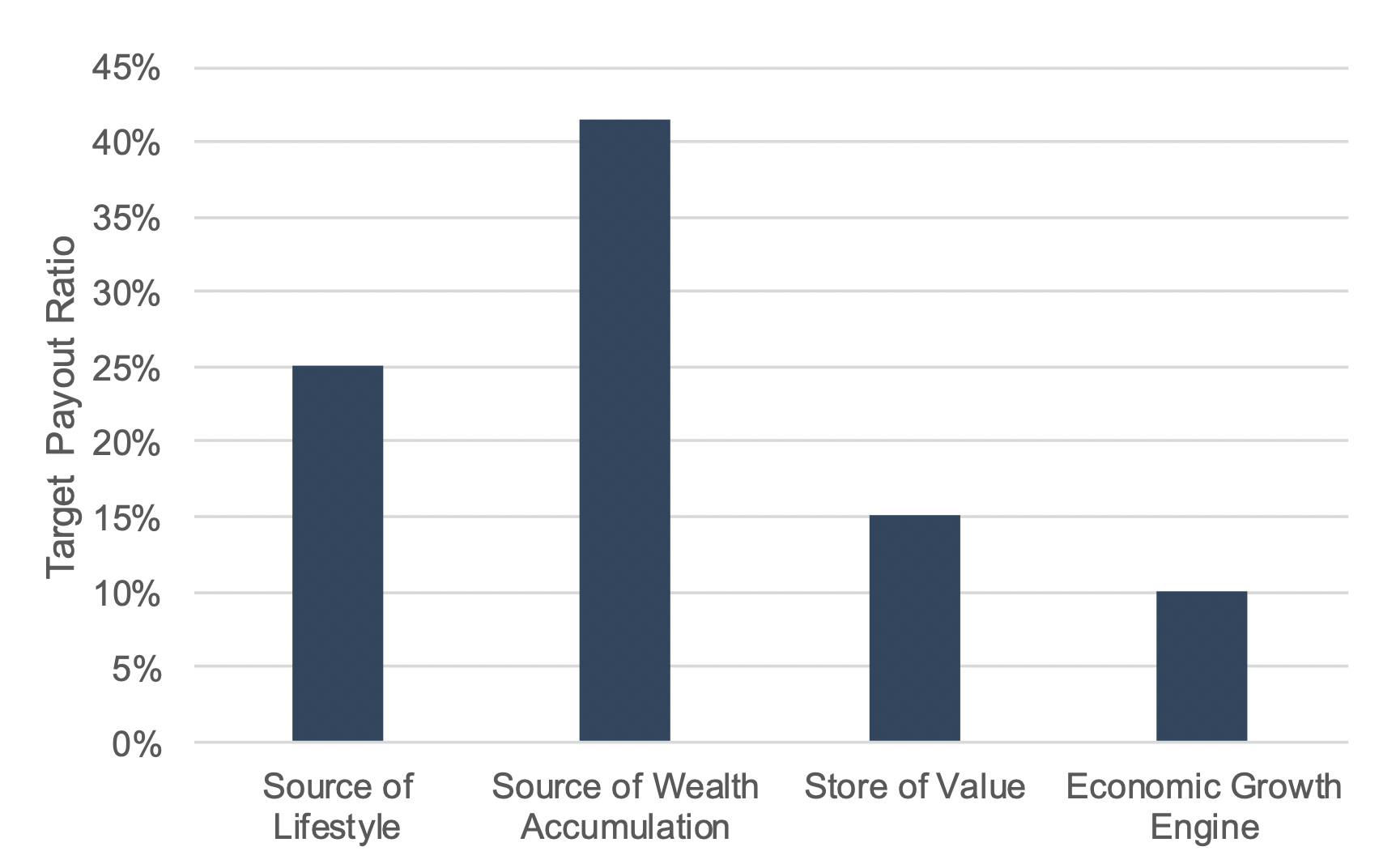 In our experience, the most successful (and peaceful) enterprising families are those in which there is consensus regarding what the family business means to the family. When there is alignment on meaning, it is easier to find alignment on dividend practices. This is borne out when we examine the median target payout ratios for businesses sorted by the different family business meanings noted in Exhibit 3. As shown in Exhibit 4, there is a clear correlation between what the family business means to the family and dividend practice.