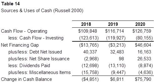 In “normal” years (i.e., 2018 and 2019), the small caps typically invest a bit more than cash flow from operations, leaving a net hole to be filled by financing activities. Of course, 2020 was far from “normal.” As we have described in the previous two posts in this series, operating cash flow increased during the year despite weak earnings because of non-cash impairment charges and reduced working capital balances. Meanwhile, companies were cautious on the investment front, curtailing both capital expenditures and M&A activity. The net result is that during 2020, operating cash flows exceeded investing cash flows by approximately $46.6 billion.