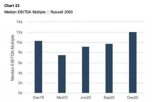 - Returns. What return are investors demanding? Returns are the sum of the yield on risk-free assets plus a premium to compensate investors for taking risk. All else equal, investor returns are inversely related to earnings multiples. The increase in multiples during 4Q20 suggests that required returns decreased. Since risk-free returns increased during the period, the return premium received for taking risk likely fell more dramatically.