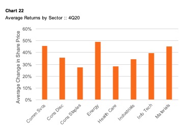The storyline changes when we turn our attention to market performance in the fourth quarter of 2020. As shown on Chart 20, the index value surpassed pre-COVID levels by almost 20%. Chart 22 summarizes average share price changes by industry for the fourth quarter of 2020.