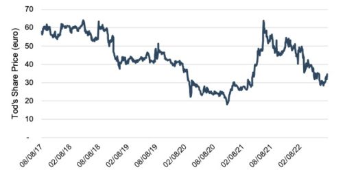 From a pandemic low of approximately €18, Tod’s share price peaked at approximately €64 per share in June 2021, from which level shares have fallen steadily to the €30 to €35 range preceding the going private announcement.