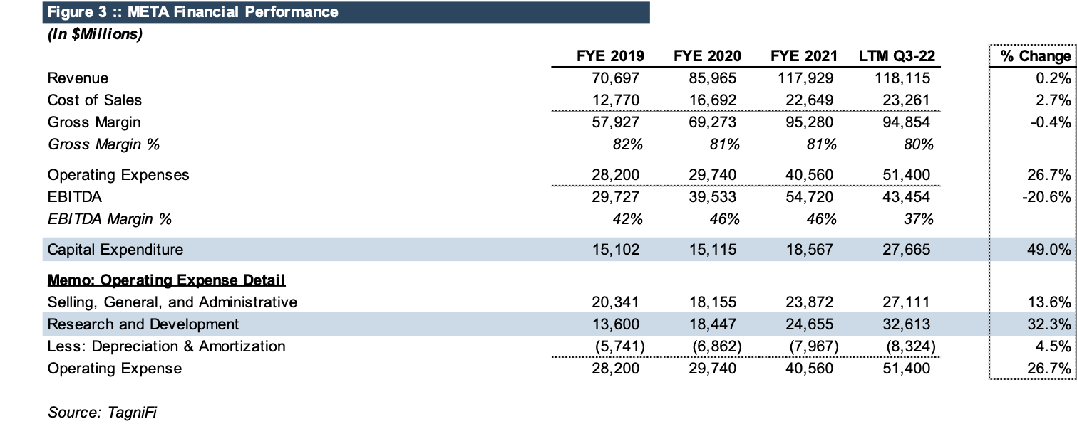 As shown in Figure 3, despite slowing revenues, Meta's capital expenditure increased nearly 50% from year-end 2021, and R&D expenses increased by over 32%. While the markets looked for belt-tightening, Mr. Zuckerberg went back for seconds.