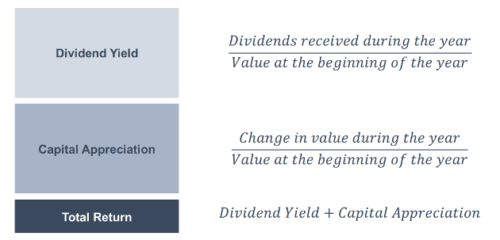 Investment returns have two components: dividend yield and capital appreciation. The yield measures the current income a business generates, while capital appreciation measures the increase in value during the period. As depicted below, total return is the sum of yield and capital appreciation.