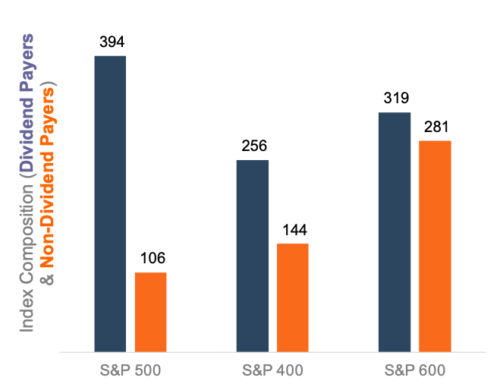 We can confirm this in general terms by looking at the prevalence of dividend payers among the small-cap (S&P 600), mid-cap (S&P 400), and large-cap (S&P 500) indices. As shown in Table 2, nearly 80% of the large-cap companies in the S&P 500 paid dividends in 2022, compared to just over half of the small-cap companies in the S&P 600.