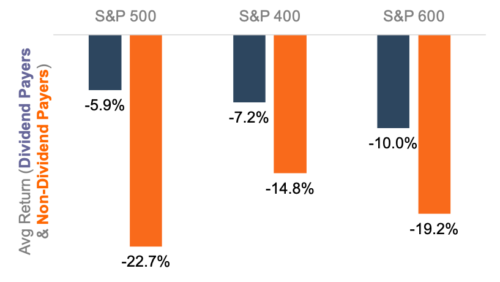 Rising interest rates do not affect all investments equally, however. The longer investors have to wait to receive cash, the more sensitive an investment is to interest rates. A steady dividend stream shortens the “duration” of investments in dividend-paying shares relative to non-dividend-paying shares. So, in a rising rate environment like 2022, basic present value math suggests that dividend-paying stocks will outperform.