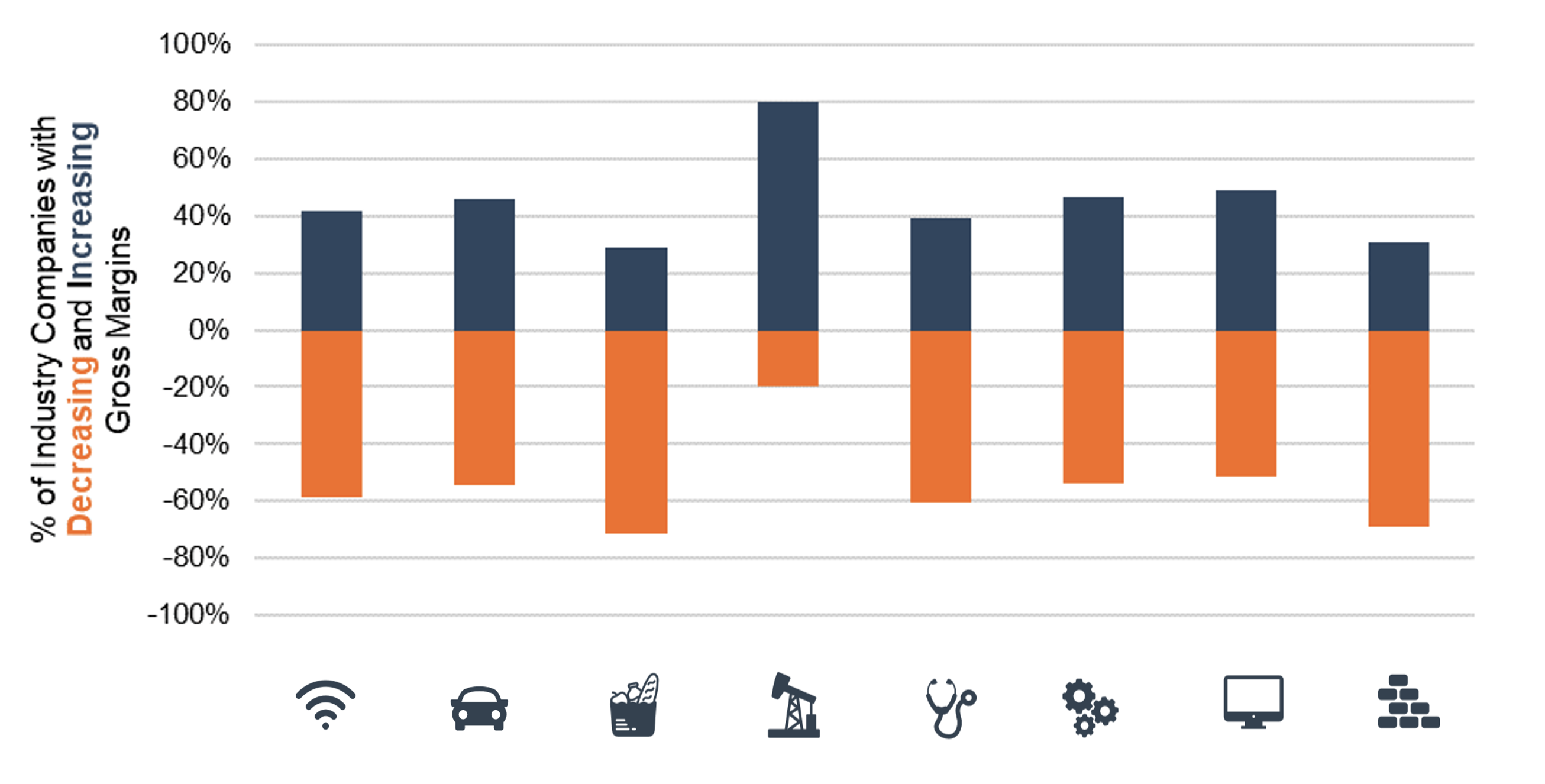 The chart below shows the number of industry constituents who saw gross margin increases and decreases in 2022 relative to 2021. Strong results in the energy sector masked gross margin challenges across other industries as companies struggled to adapt to an inflationary environment not seen since the early 1980s. The majority of energy companies saw gross margin expansion, while the majority of companies in all other industry sectors saw gross margin decline.