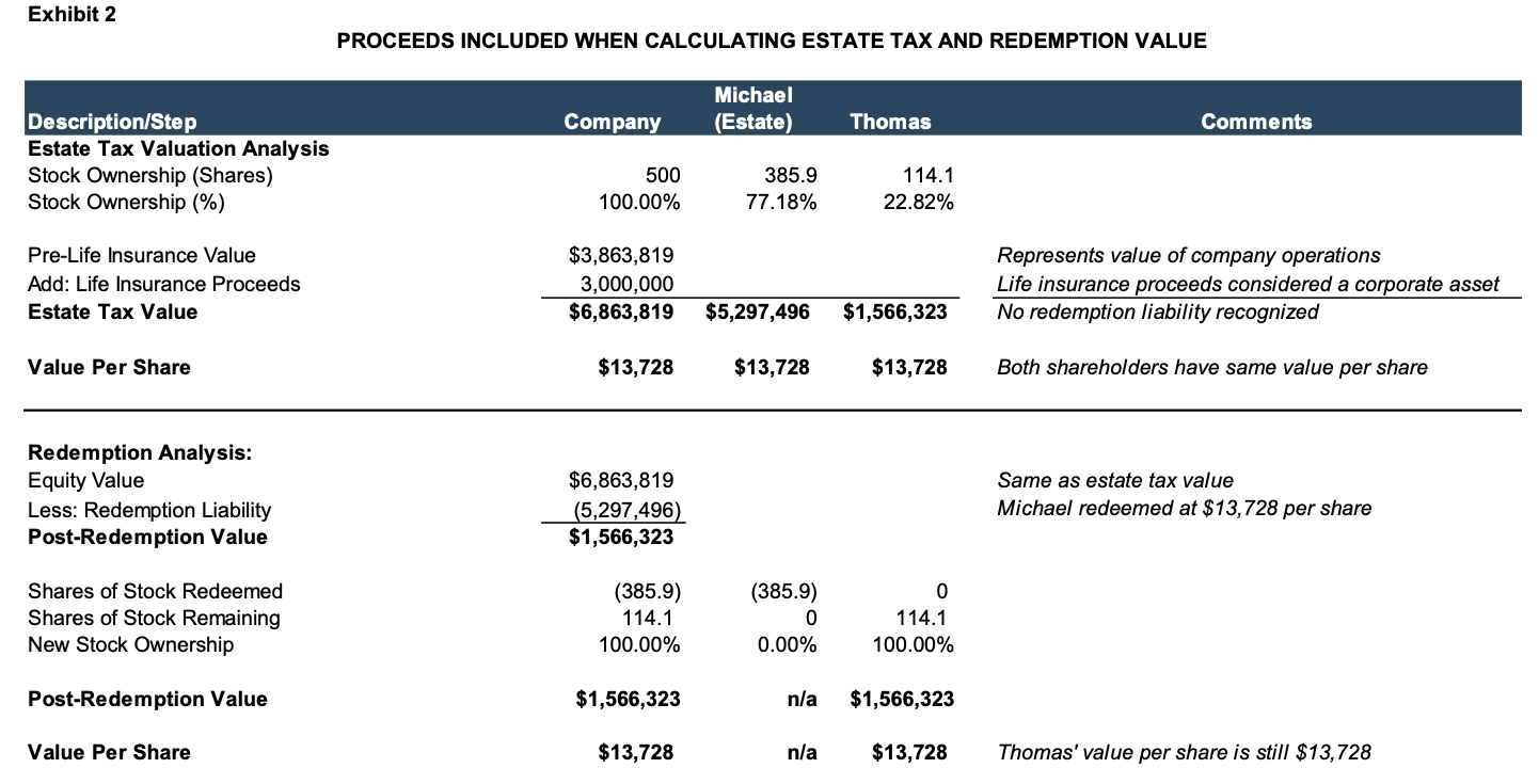 Assuming the estate was redeemed at the IRS value of Crown C (the IRS did not include the $500,000 in excess life insurance proceeds), the post-redemption value of the company’s equity is $1.6 million or $13,728 per share ($1.6million / 114.1), and Thomas is the sole remaining shareholder.