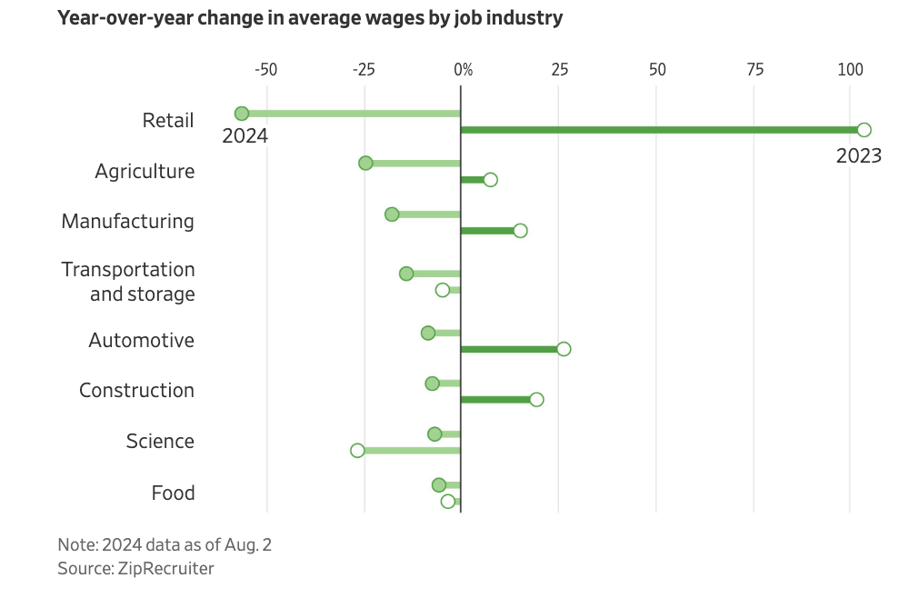 The graphic below shows the year-over-year change in average wages by job industry, with retail leading the way down ~56% from 2023.