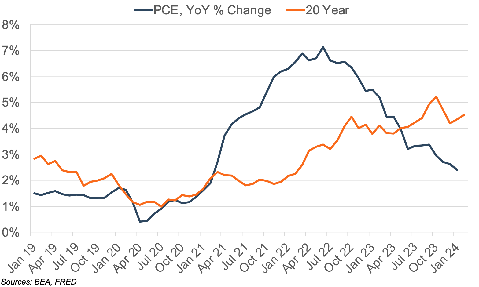 Rising inflation has been top of mind for business owners (and everyone for that matter) over the last few years. As measured by the Federal Reserve’s preferred gauge — the personal consumption expenditures price index — inflation increased from an average of 1.5% in 2019 and 2020 to 5.0% in 2022. Inflation has since decelerated from its peak in 2022 to 2.8% in January 2024 but still remains above the Federal Reserve’s target of 2.0%. In an effort to curb inflation, the Federal Reserve hiked the fed funds target range, leading to a sharp increase in interest rates over 2022 and 2023. The yield on the 20-year US treasury increased from less than 2.0% in 2019 and 2020 to a peak of about 5.2% in October of 2023. Yields currently stand at approximately 4.5%.