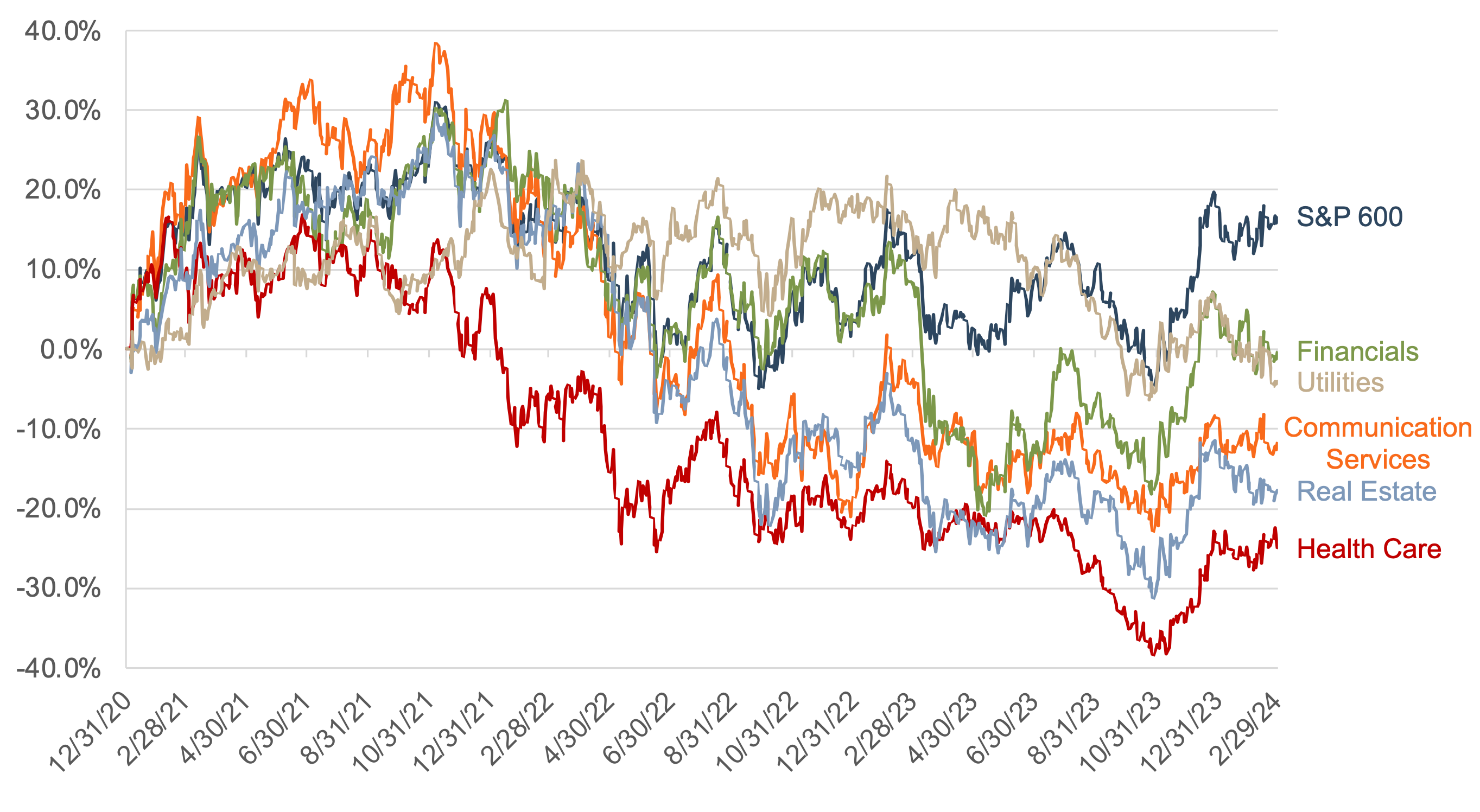 Since the beginning of 2021, when inflation began turning higher, the S&P 600 Small Cap Index has increased about 17%. However, several S&P 600 Sector Indices have underperformed the broader index over this period, including financials (0%), utilities (-4%), communication services (-12%), real estate (-18%), and healthcare (-25%), per Figure 3. It’s clear that certain industries have been able to push through the higher-rate environment, while investors are skeptical of the “new normal” in others.