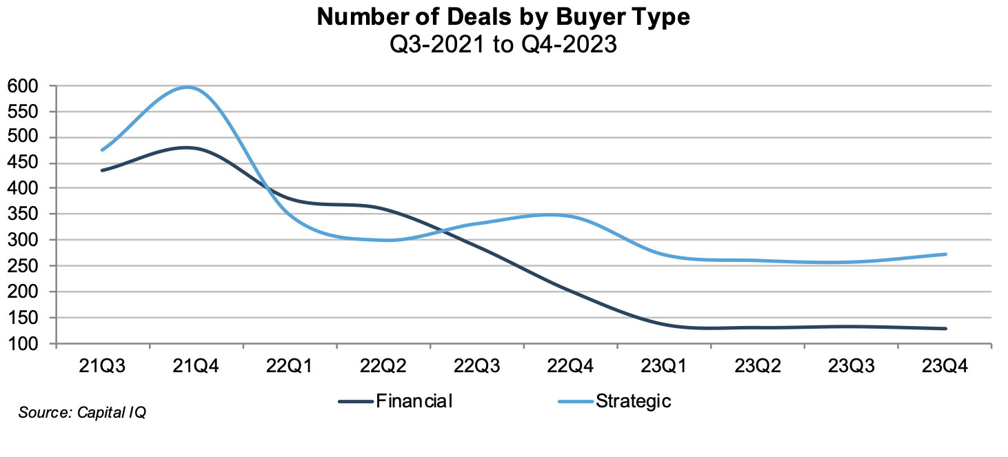As shown in the chart below, overall U.S. deal activity, as compiled by Capital IQ in the fourth quarter, was little changed from the depressed levels observed in the first three quarters of 2023. Pitchbook reports that U.S. PE middle-market activity, defined as deals with an enterprise value of less than $1 billion, bounced back for the second time in the last eight quarters in the fourth quarter of 2023, suggesting that the depressed levels realized in the second and third quarters of 2023 could represent the trough in the current middle market M&A cycle.