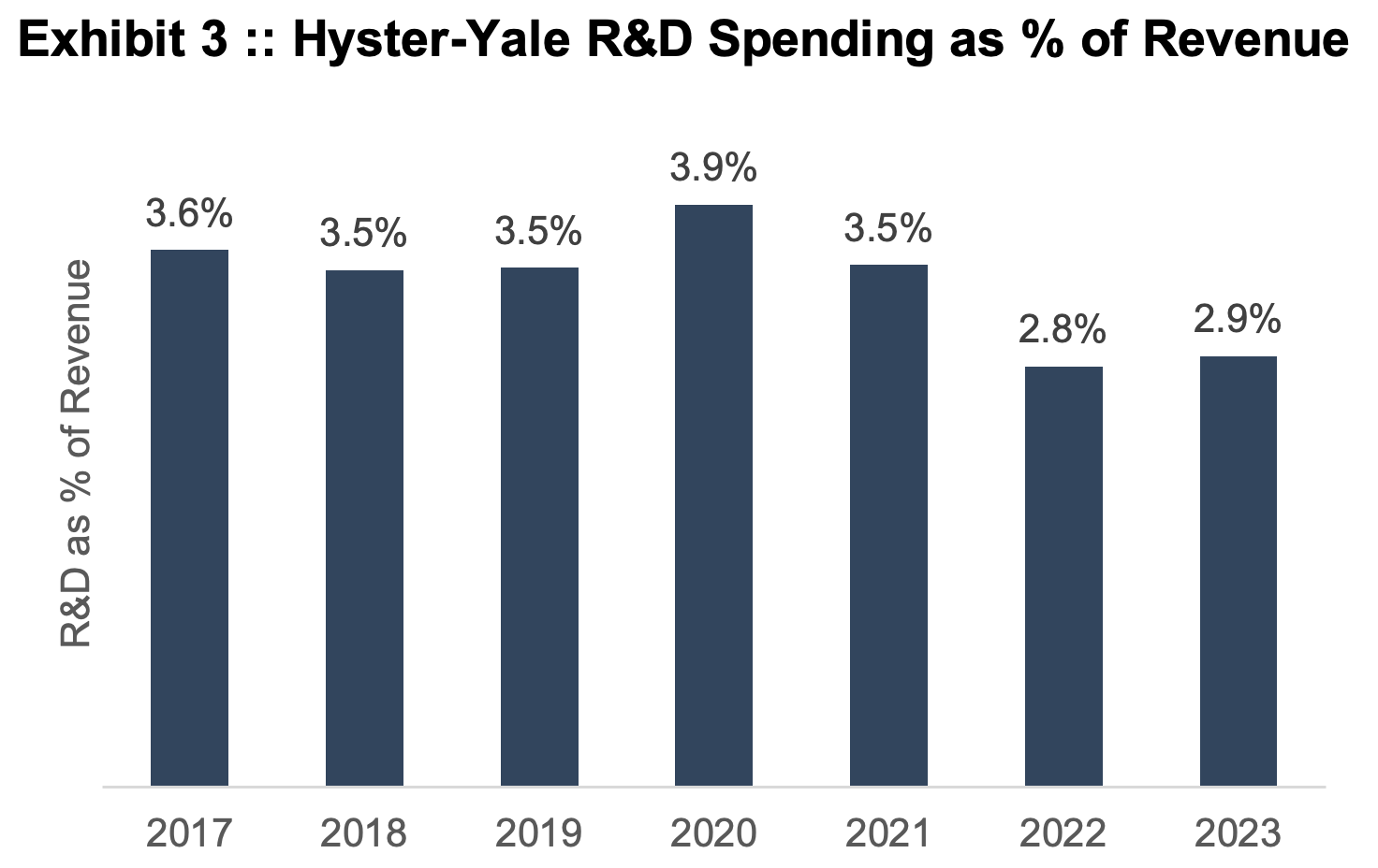 As a percentage of revenue, R&D spending at Hyster-Yale was 2.8% and 2.9% in 2022 and 2023, respectively, compared to an average of 3.6% for the preceding five years, as shown in Exhibit 3.